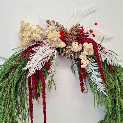 A modern, kiwi take on a Christmas wreath! Lush rimu (which is slowly dry) and a cute topping of dried/preserved goodies.